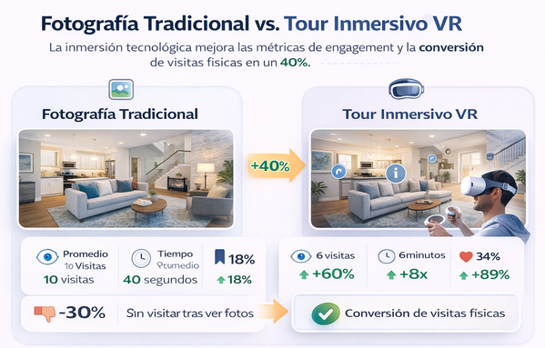 Según Matterport (2025), las propiedades con tours inmersivos reciben 95% más consultas y cierran 31% más rápido que las que solo tienen fotografías. No es una mejora incremental, es un salto cualitativo en la experiencia de compra.