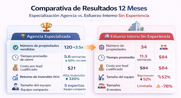 Costo de tecnología: Las herramientas enterprise de IA predictiva, CRM inmobiliario especializado y producción de contenidos inmersivos representan inversiones de $50,000-150,000/año. Una agencia especializada distribuye estos costos entre múltiples clientes, haciendo accible lo que individualmente es prohibitivo.